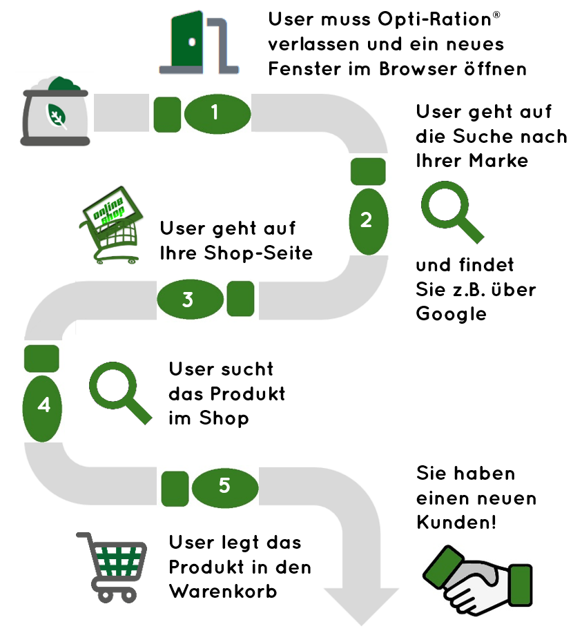 Kunden erhal­ten über den Link wei­ter­ge­hen­de Informationen, zum Beispiel über die Zusammensetzung der Futtermittel und deren Anwendungsbereiche. Außerdem fin­den sie über unse­re Datenbank und bei der Rationsberechnung den direk­ten Weg zu Ihrem Shop – so kön­nen sie das in der Datenbank gefun­de­ne Futter direkt bestel­len. Kunden lie­ben kur­ze Wege!