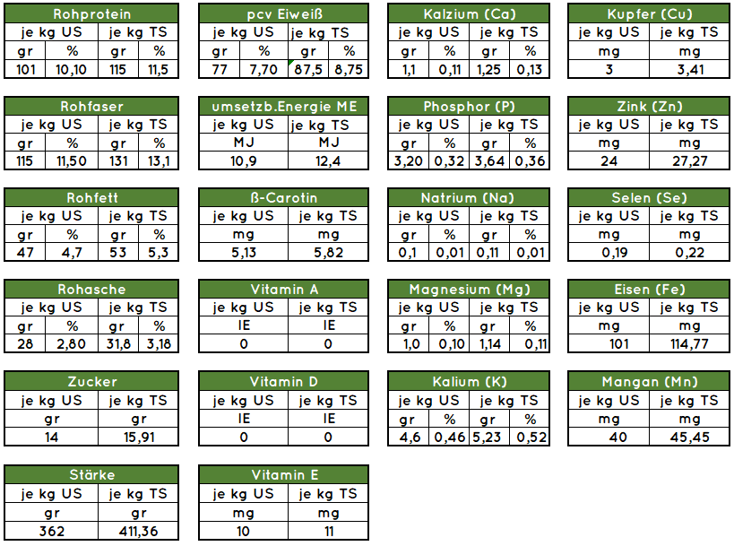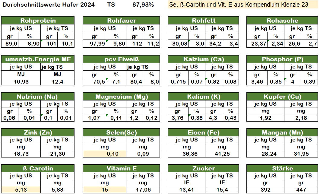 Im Vergleich dazu die Durchschnittswerten Hafer, Inland 550 gr/ltr. Trockensubstanz 88%, Quelle: Coenen/Vervuert 2019