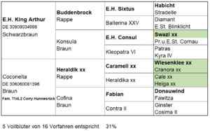 Wenn dir Abstammungspapiere vorliegen, findest du Vollblüter durch die Kürzel XX für engl. Vollblut, OX für arab. Vollblut, AA für Anglo-Araber und ShA für Shagya-Araber hinter dem Namen der Vorfahren. Hier ein Beispiel: