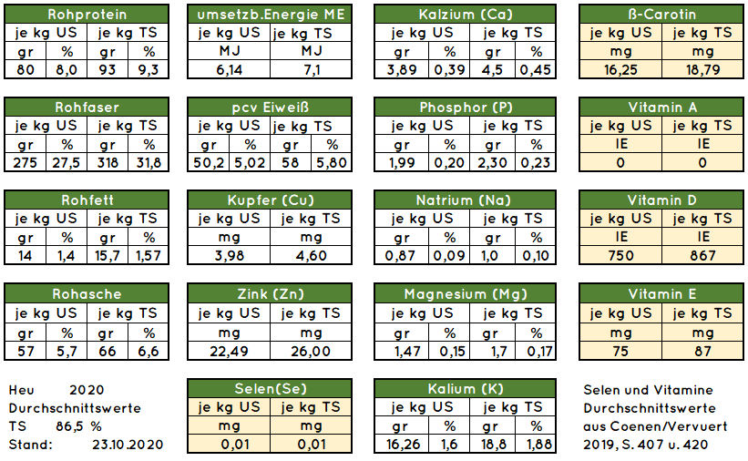 Klick auf das Bild vergrößert die Tabelle für Werte Heu