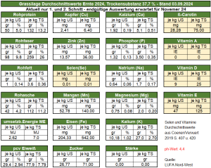 Selen und Vitamine wurden nicht untersucht, hier sind Werte aus Coenen/Vervuert 2019 und dem Kompendium Kienzle 2023 hinterlegt.